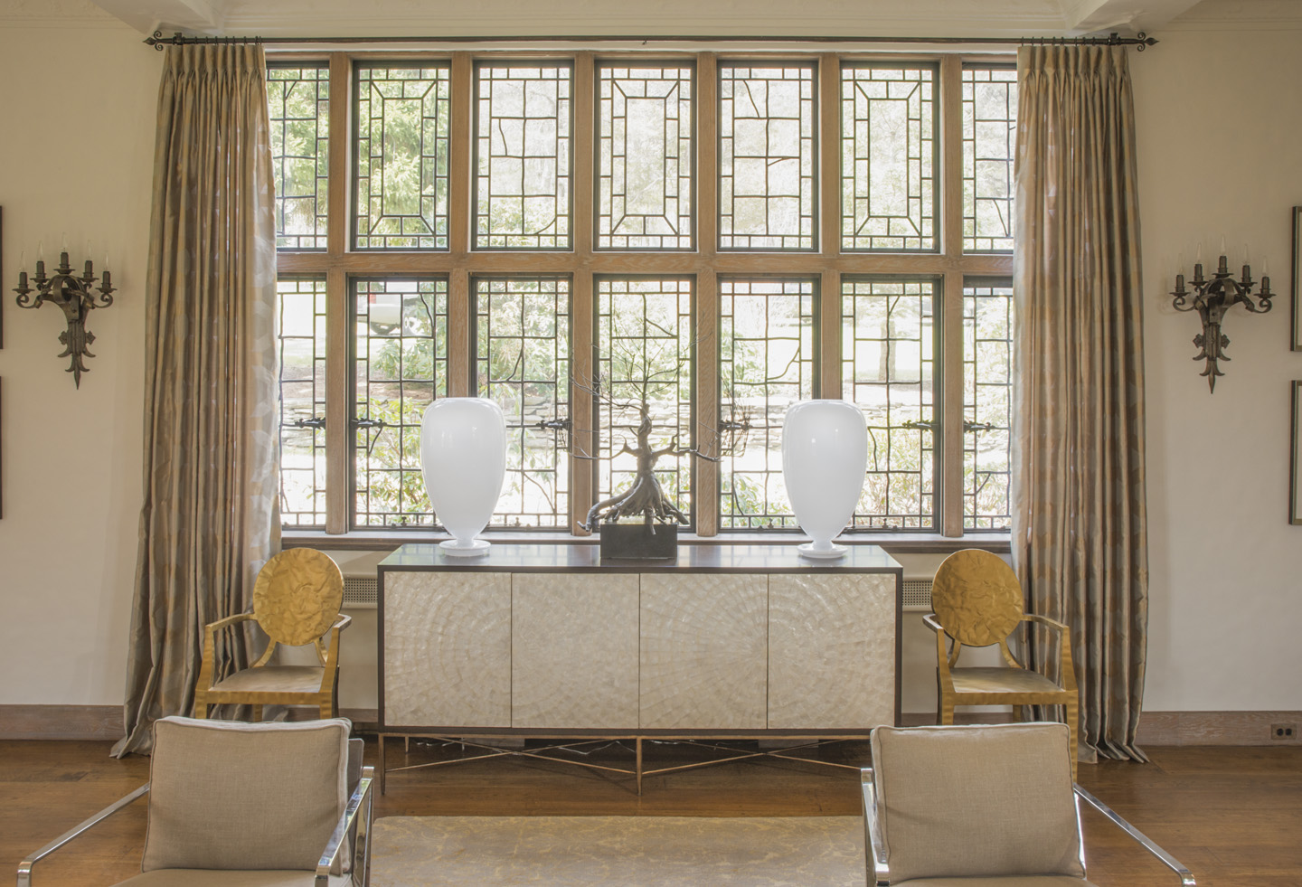 Take what could otherwise be the bowling alley of a living room, with an immense, literally walk-in fireplace: Interior designer Richard Ott adeptly compartmentalized the large space into three areas, anchoring the central seating area at the fireplace with massive lamps by Global Views, with a gold branching detail that evokes the leading in the windows, echoed again in a beautiful bronze bonsai sculpture. A second portion of the room is devoted to the grand piano, while the focal point in the third area is the chess table.